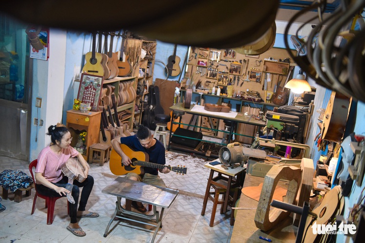 Driven by their passion for music, Nguyen Buu Thang and Le Thi Thanh Tam, a couple in Ho Chi Minh City’s Binh Tan District, learn to build guitars by hand.