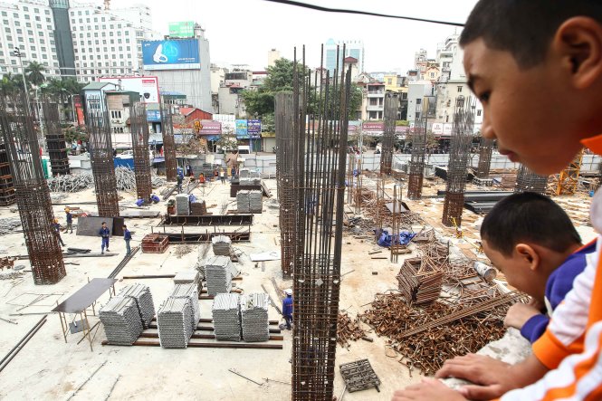 Kids look down to the construction site of the urban railway project. Photo: Tuoi Tre