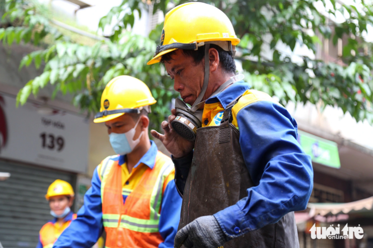 | A drainage worker goes into a manhole to clear waste oil, fat, and grease in downtown Ho Chi Minh City. Photo: Phuong Quyen / Tuoi Tre |