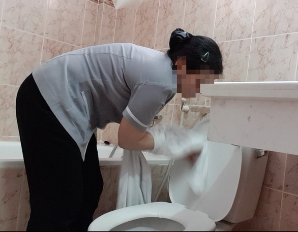 | A housekeeper cleans a toilet with a bath towel at a hotel in Ho Chi Minh City. Photo: Tuoi Tre |