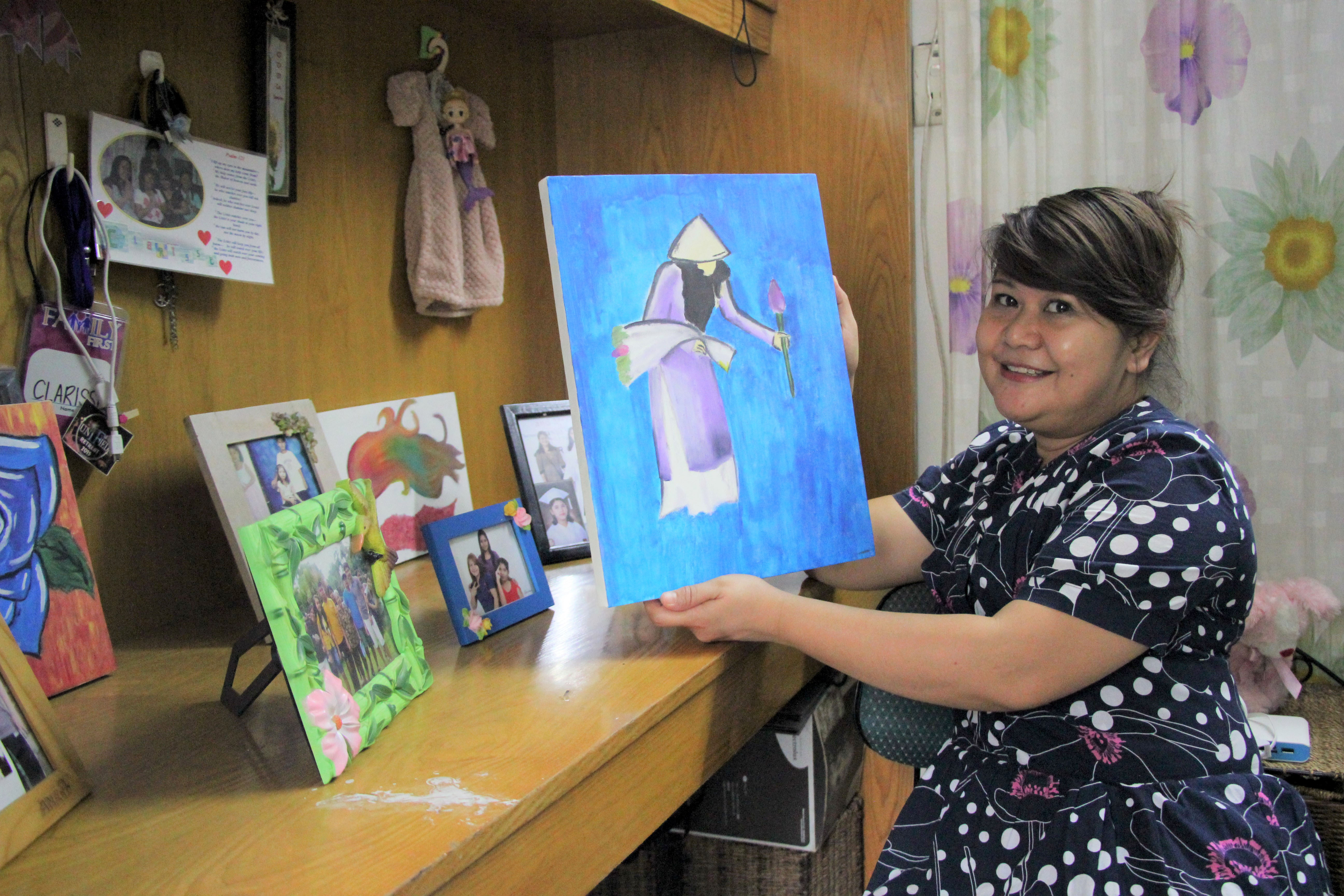 | Clarisse Cantos shows a painting made by her daughter displayed in her rented room in District 3, Ho Chi Minh City. Photo: Tuoi Tre |