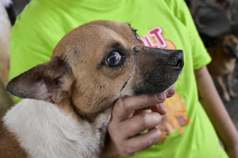 A stray dog at a dog shelter in Jakarta, with a scar from having its snout tightly bound with rope before it was rescued from slaughter at a restaurant selling dog meat dishes © BAY ISMOYO / AFP