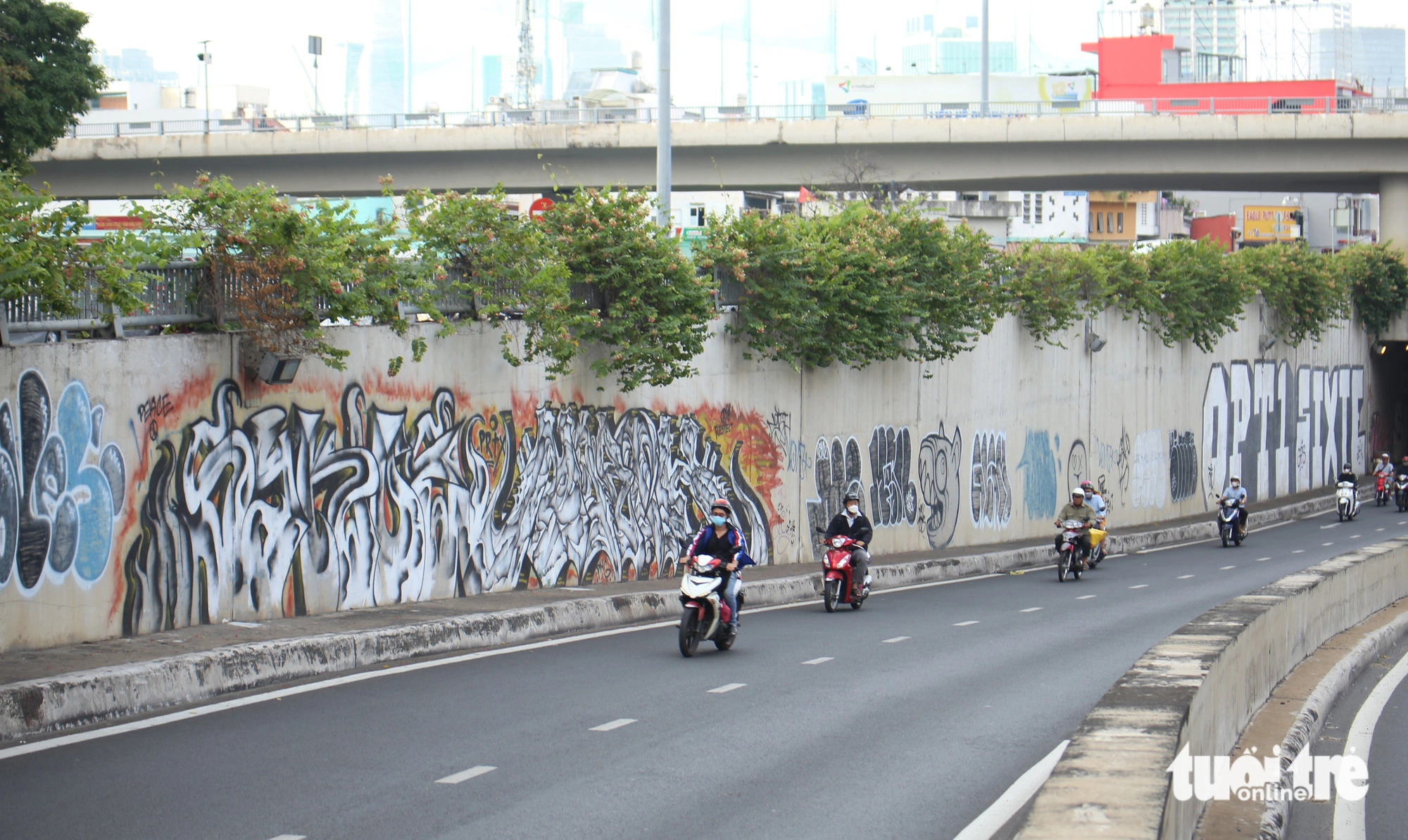 | Lots of graffiti have almost cover a wall at a tunnel in Binh Thanh District for years. Photo: Minh Hoa / Tuoi Tre |