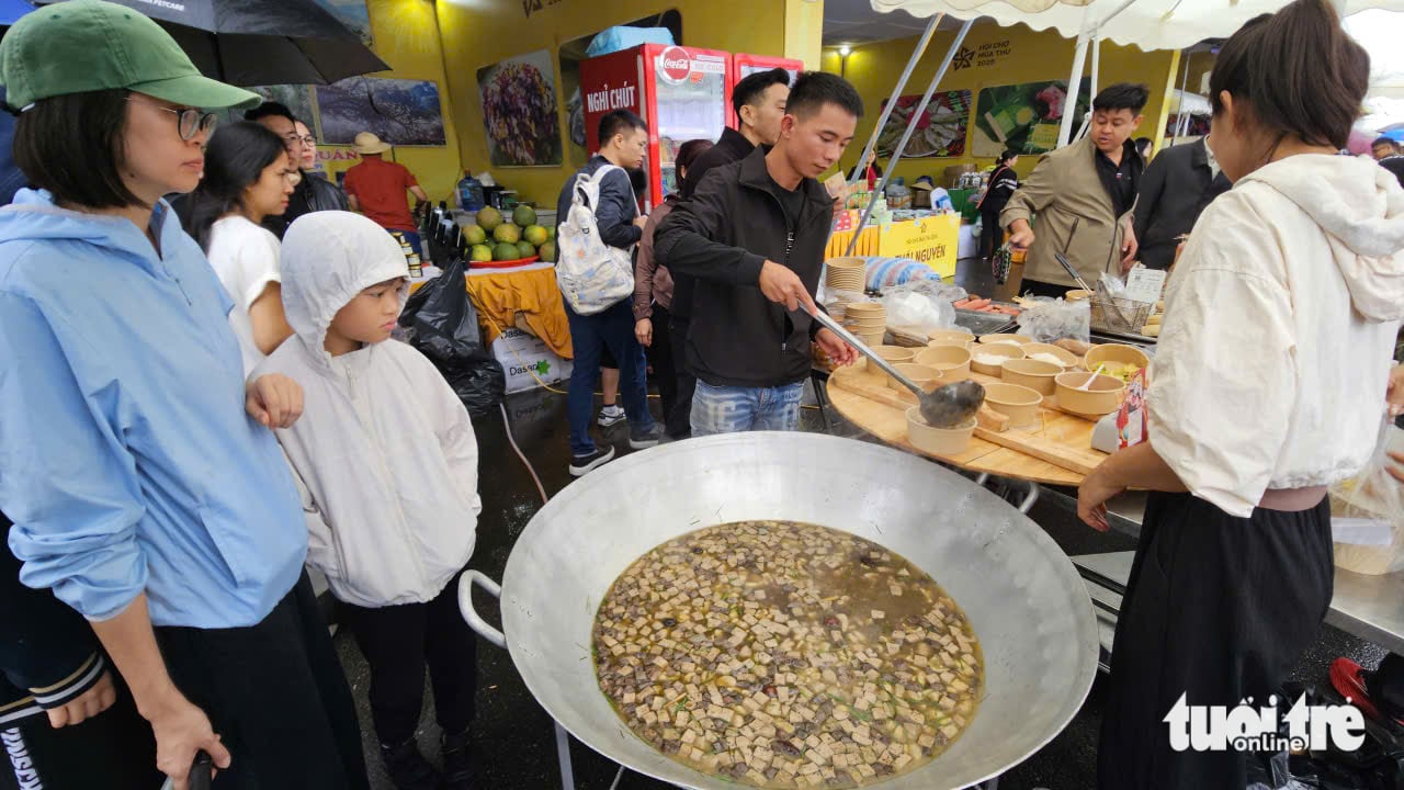 At the southern courtyard of the exhibition center, a crowd gathers around a large steaming cast-iron pan at the booth of Tuyen Quang Province.