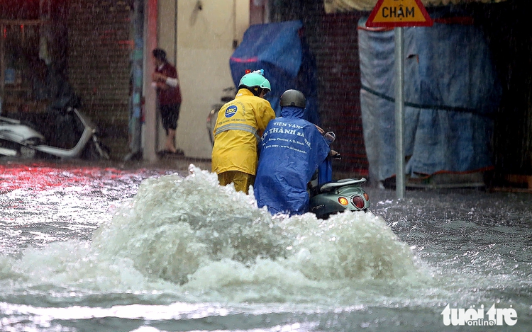 Motorbikes wade through the flooded Nguyen Van Khoi Street in Go Vap District, Ho Chi Minh City, May 10, 2025. Photo: Ngoc Khai / Tuoi Tre