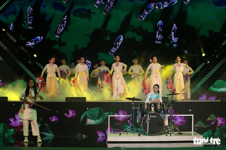 | A folk music performance during the Ho Chi Minh City Ao Dai Festival at Nguyen Hue Pedestrian Street in Ho Chi Minh City, June 27, 2020. Photo: Ngoc Phuong / Tuoi Tre |