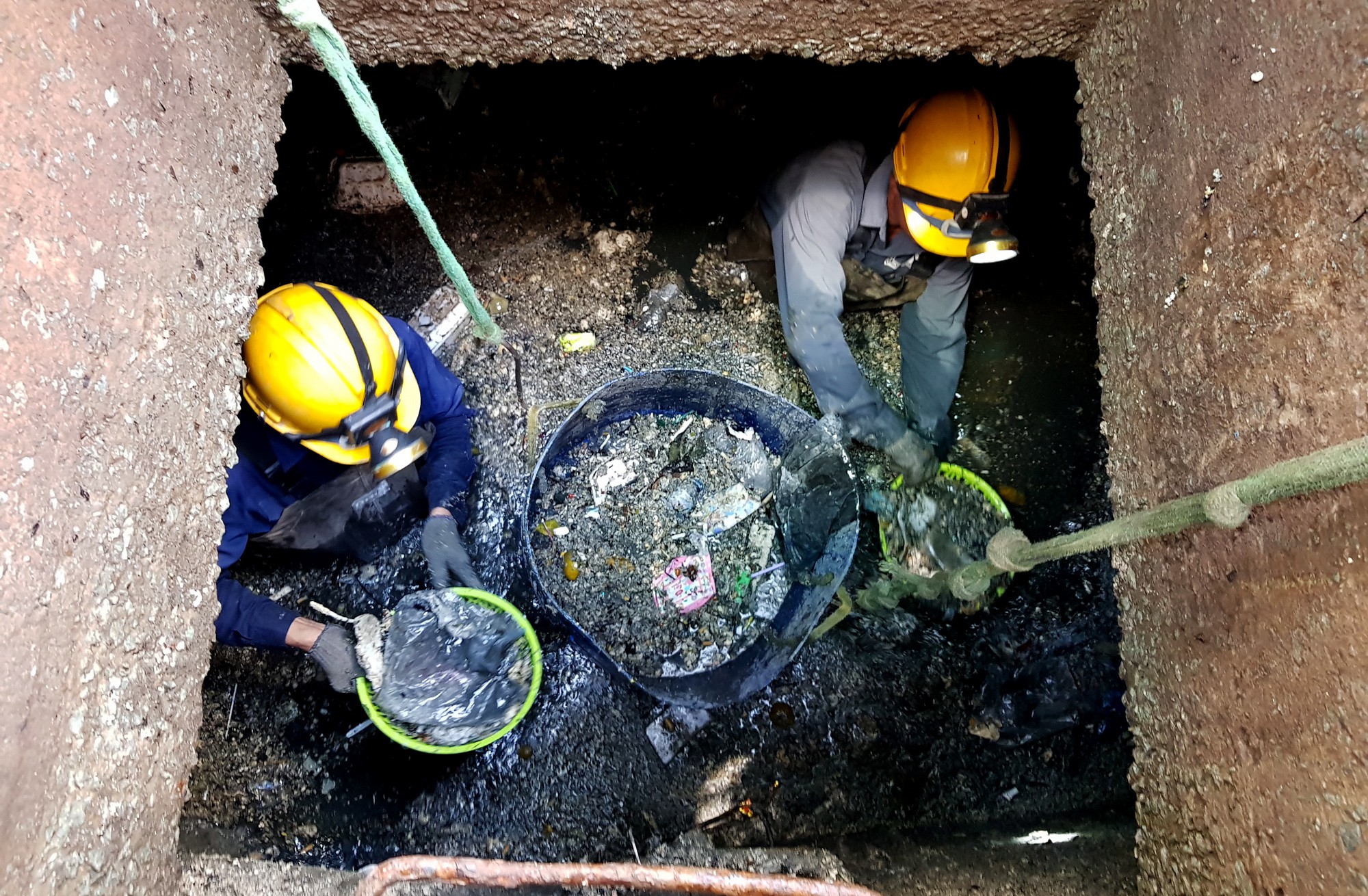 | A drainage worker watches a garbage bucket being lifted from a sewage pipe in Ho Chi Minh City, Vietnam. Photo: Tuoi Tre |