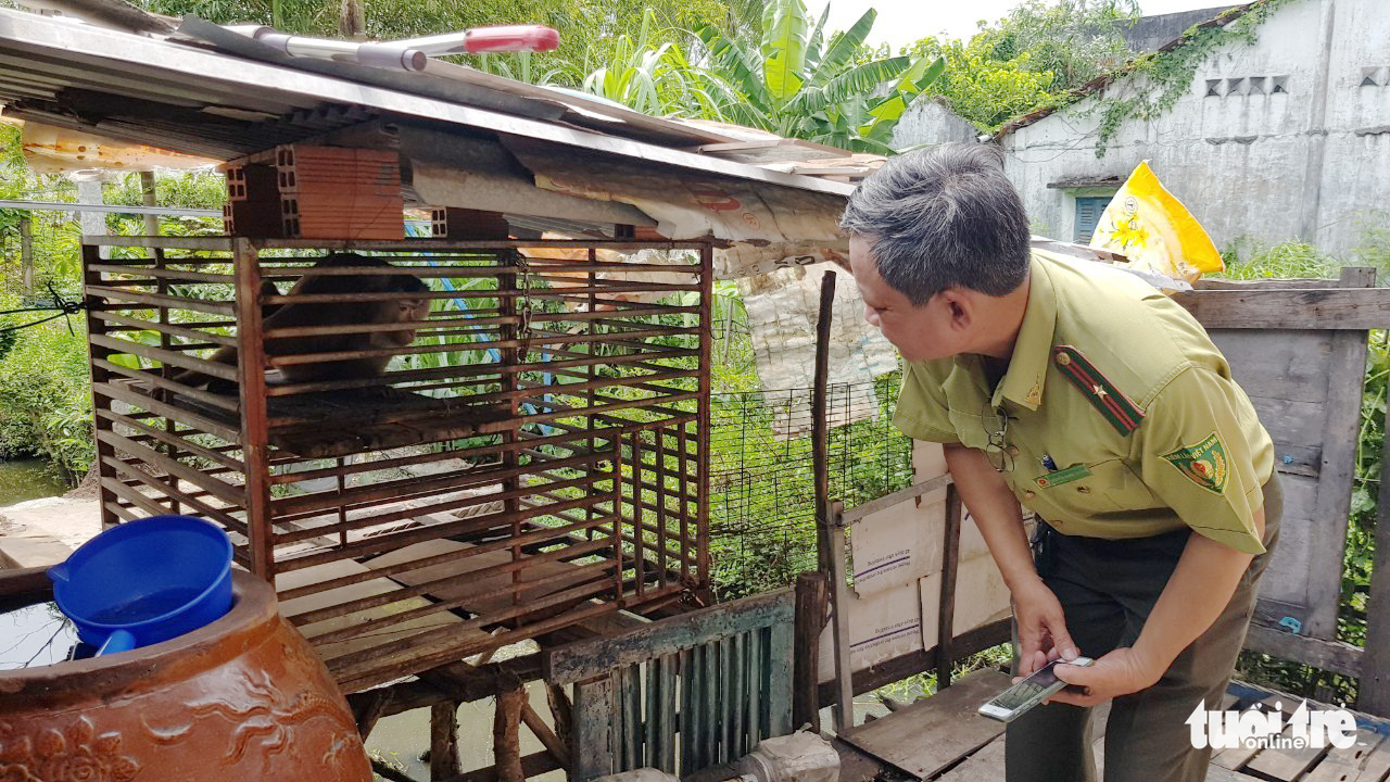 | A ranger watches a pig-tailed macaque caged at the house of Dinh Minh Canh in Binh Chanh District, Ho Chi Minh City, April 18, 2022. Photo: Ngoc Khai / Tuoi Tre |