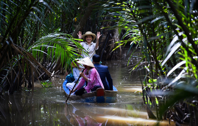 In front of the Rach Mieu Bridge, Moussaieff borrowed the conical hat from the tour guide and posed for a photo at the prow with Iceland’s Honorary Consulate General Le Nu Thuy Duong, who is the general director of Long Thanh Golf Investment Trading Joint Stock Company.
