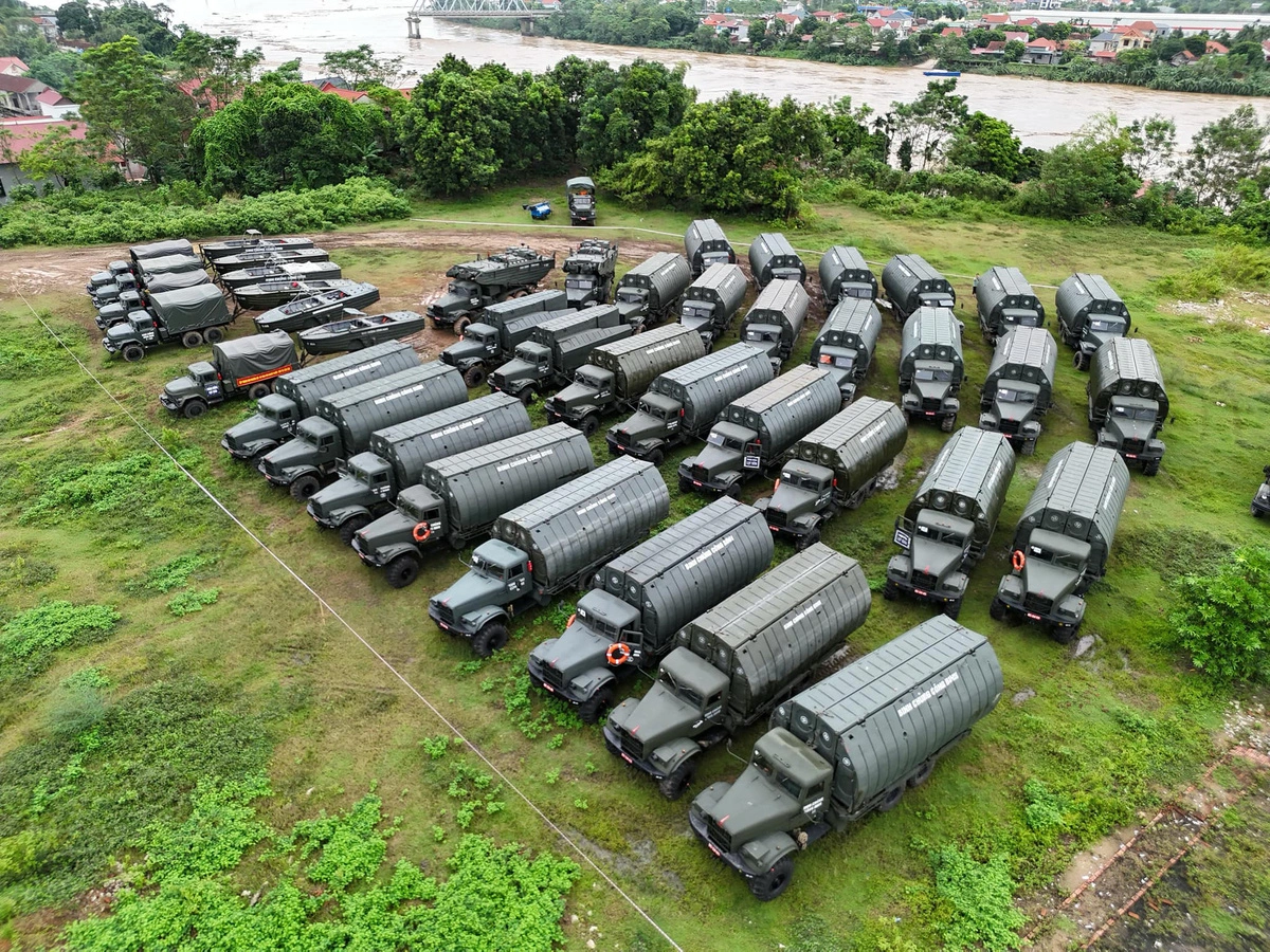 | As many as 78 pieces of machines and equipment are brought to the area of the Phong Chau Bridge in Phu Tho Province, northern Vietnam. Photo: N.H. / Tuoi Tre |