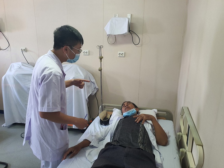 | A doctor tends to a local resident on the hospital ship Khanh Hoa 01 of the Vietnam People’s Navy, which is docked at Vung Ro Port in Phu Yen Province, June 21, 2022. Photo: Trung Tran / Tuoi Tre |