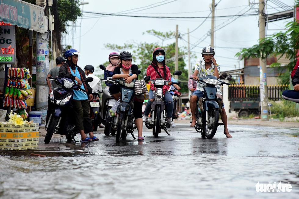 In District 2’s Thao Dien neighborhood, tidal water is a constant annoyance on Quoc Huong and Nguyen Van Huong Streets, creating serious headaches for commuters and residents.