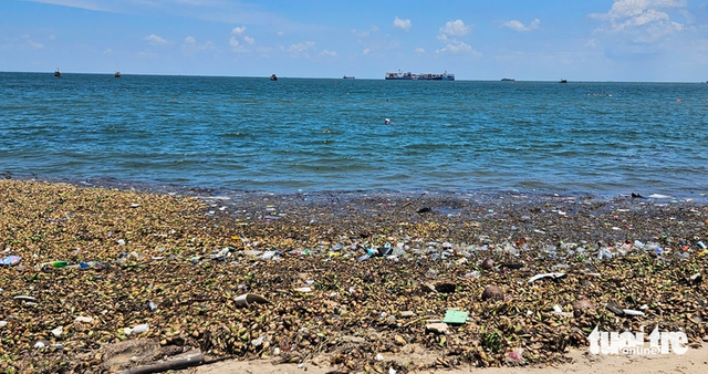 “Seeing the hyacinths pile up on the beach doesn’t bother me much as they’re just plants. But when you look closely, you see all sorts of garbage mixed in. That’s what’s truly horrifying,” said a tourist walking along Vung Tau beach.