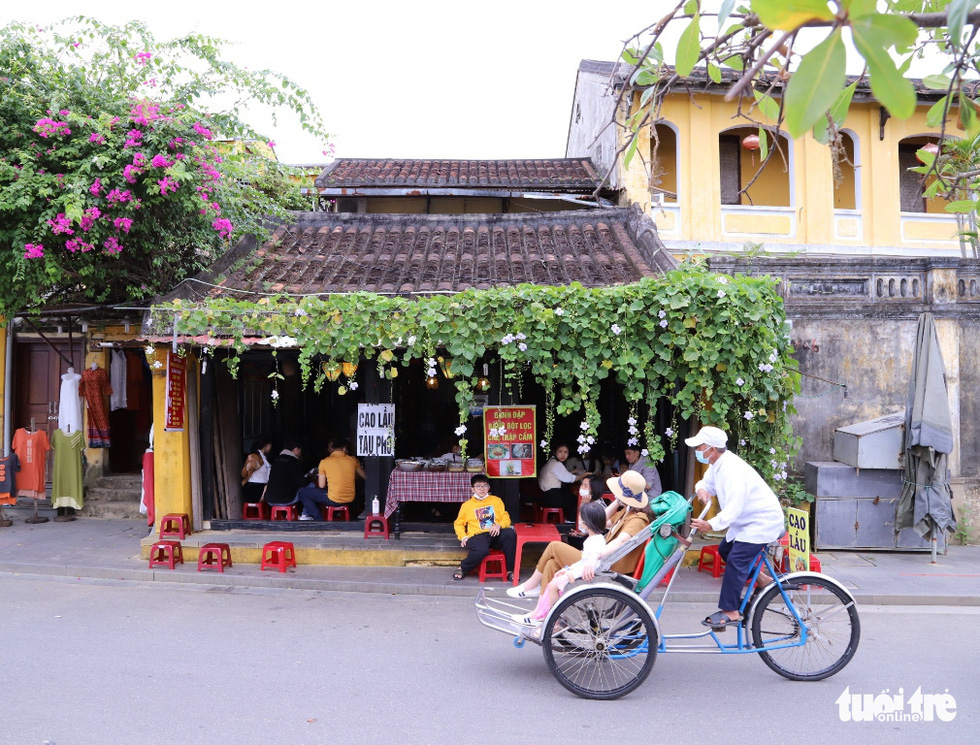 | Tourists take a 'xich lo' (cycle rickshaw) to go around the UNESCO-recognized Hoi An Ancient Town in Hoi An City, Quang Nam Province, Vietnam on February 4, 2022. Photo: D.C. / Tuoi Tre |