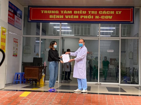 | Vietnam’s COVID-19 patient No. 52 (left) receives a hopital discharge certificate in Ha Nam Province in this supplied photo taken on April 16, 2020. |