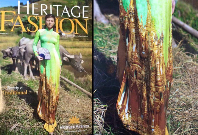 The November edition of Vietnam Airlines-run Heritage Fashion features a model wearing ao dai on its cover, with what is said to be Myanmar’s renowned Shwedagon Pagoda printed on the traditional dress.