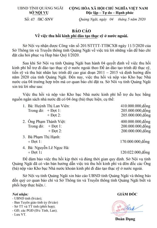 | A document issued on May 4, 2020 by the Quang Ngai Province Department of Internal Affairs regarding the refund of the financial assistance provided to the children of four provincial officials and ex-officials to sponsor their overseas education. Photo: Tran Mai / Tuoi Tre |