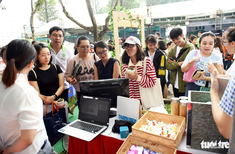 | People visit an organic vegetable booth at Song Xanh Festival at Le Van Tam Park, District 1, Ho Chi Minh City, June 2, 2019. Photo: Duyen Phan / Tuoi Tre |